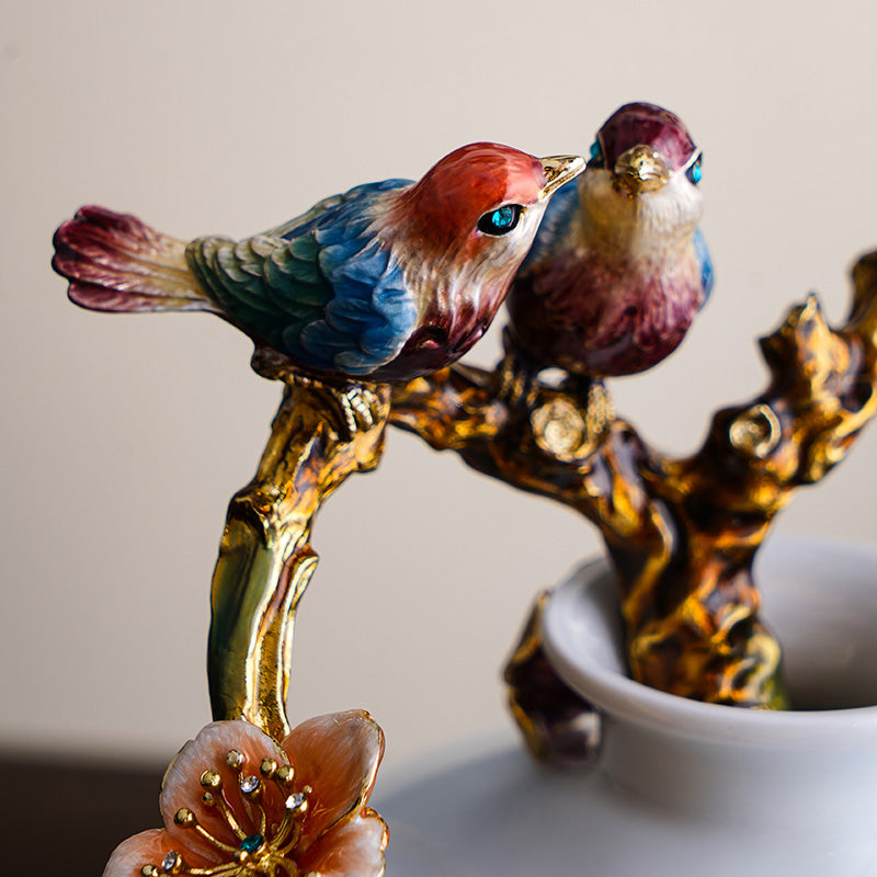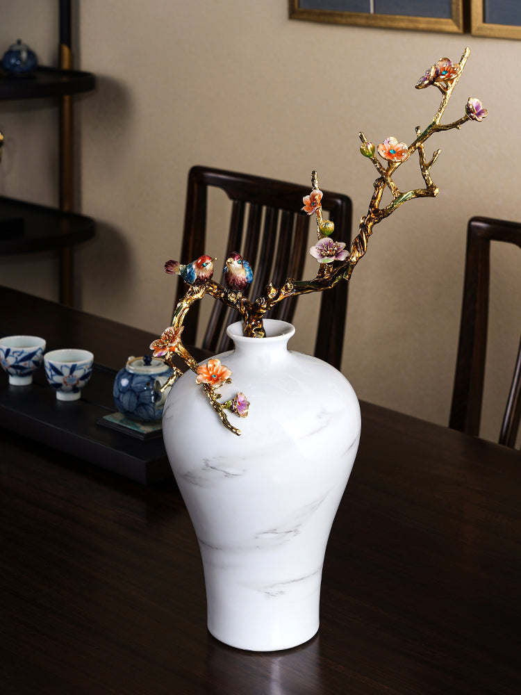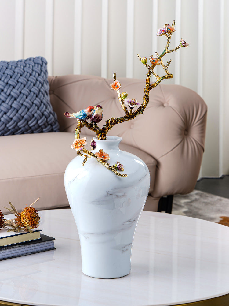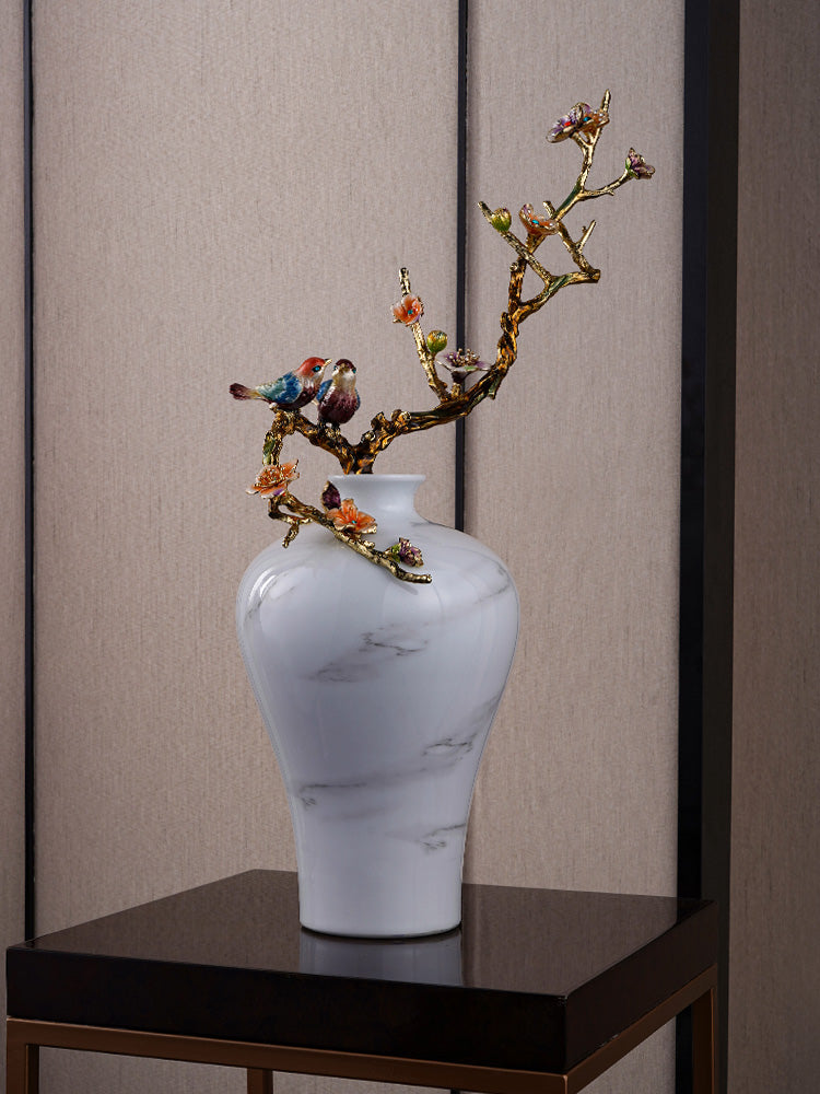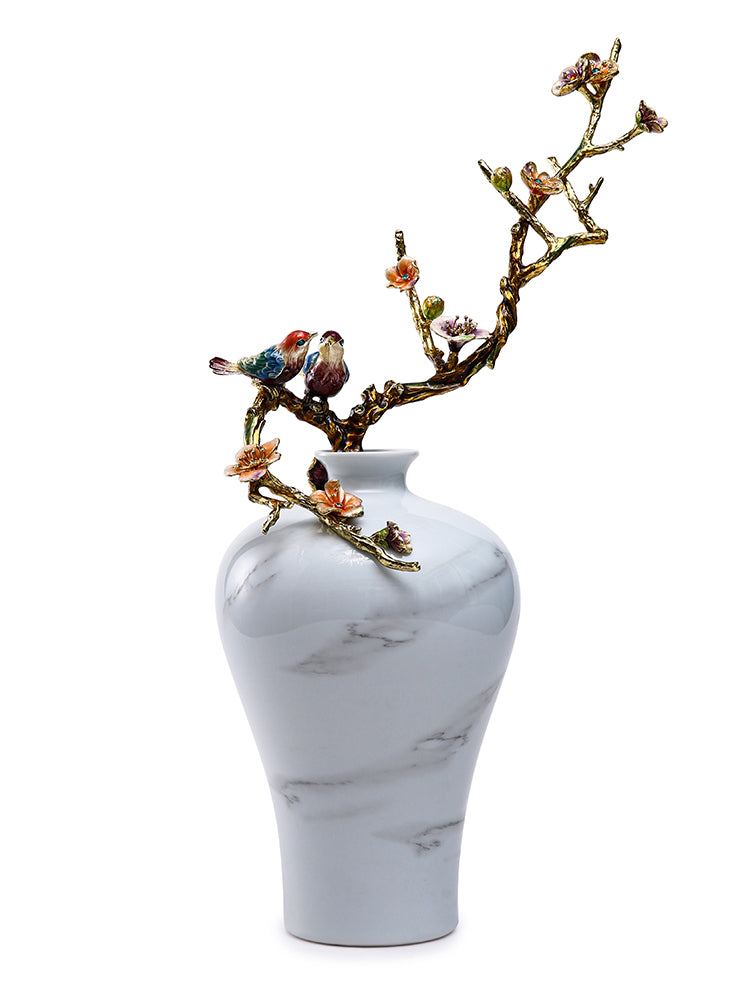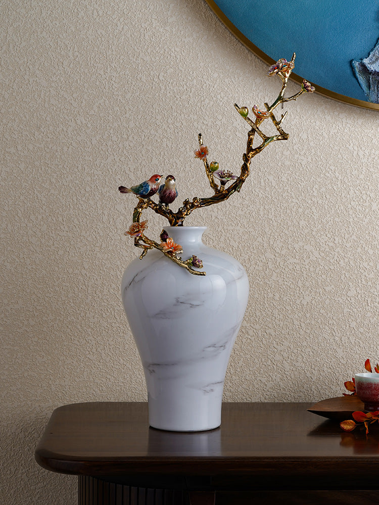 لوحة هادئة ذات عروق رخامية تتزين بغصن ذهبي وأزهار رقيقة، حيث يهمس طائران مغرمان برومانسية خالدة وفخامة حرفية في مساحة معيشتك.