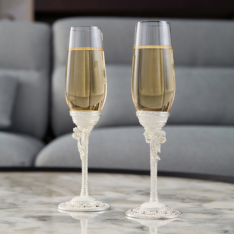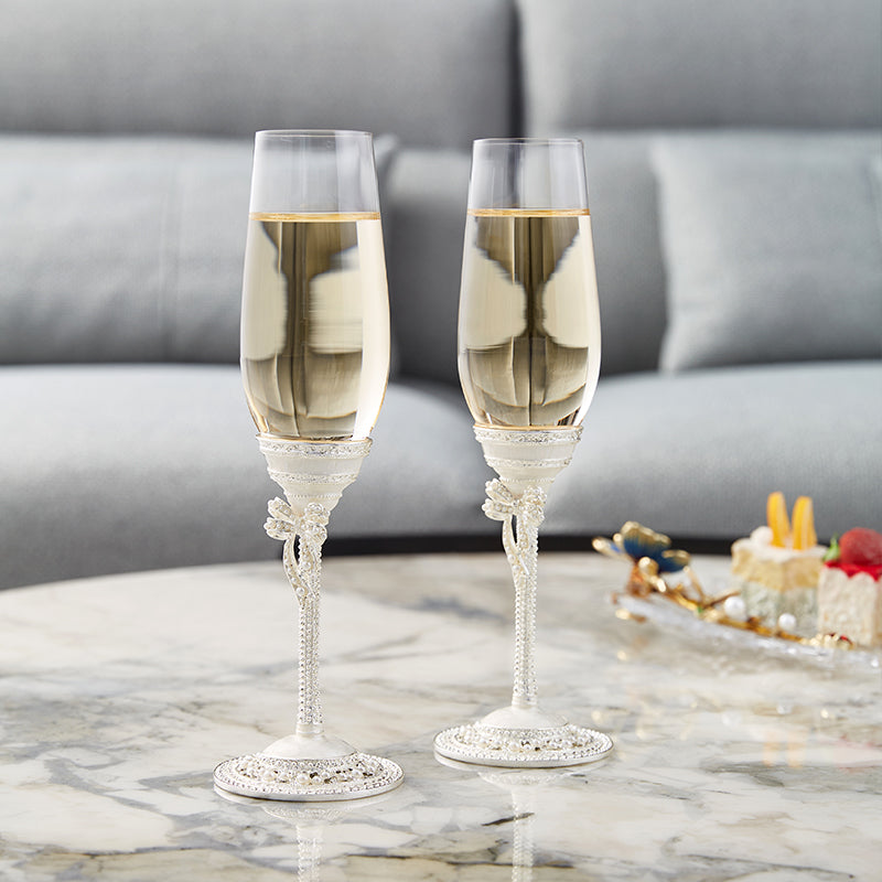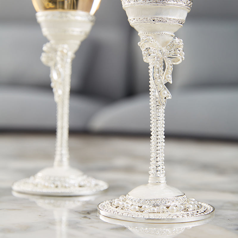 تجسد هذه الكؤوس رؤية للنقاء والسحر الخالد للعروس، وتتميز بمينا عاجي مزين باللؤلؤ المرصع يدويًا وشرائط ذهبية رقيقة، مما يحول كل نخب احتفالي إلى لحظة من النعمة النقية والمشرقة.
