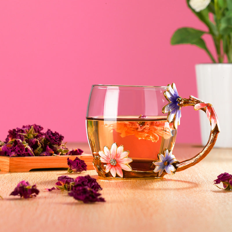 ملاذ زجاجي ساحر مزين بأزهار الجمشت المرسومة يدويًا والكروم الذهبية، يحول طقوس شرب الشاي إلى ملاذ حديقة مشمس يتميز بالأناقة الحرفية الخالصة.