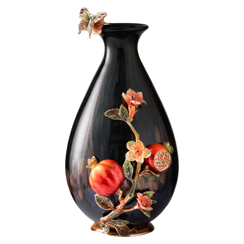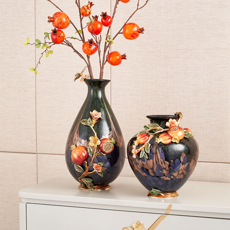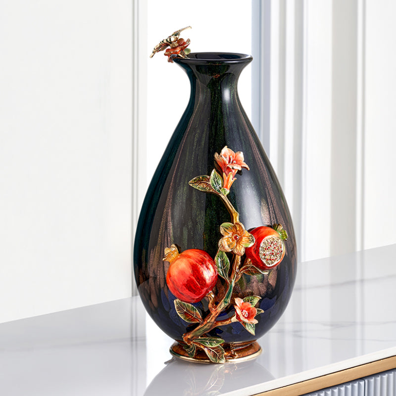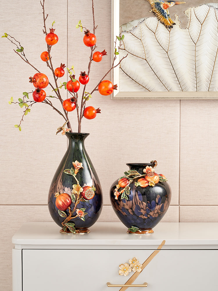 مزهرية زجاجية مصنوعة يدويًا، مزينة بشعر الخريف بأوراق ذهبية وألوان ترابية غنية. كل انحناءة تعكس روعة الطبيعة الموسمية، محولةً أي مساحة إلى ملاذ نباتي أنيق.
