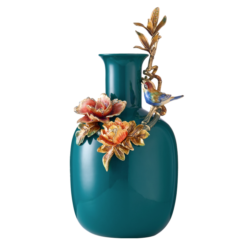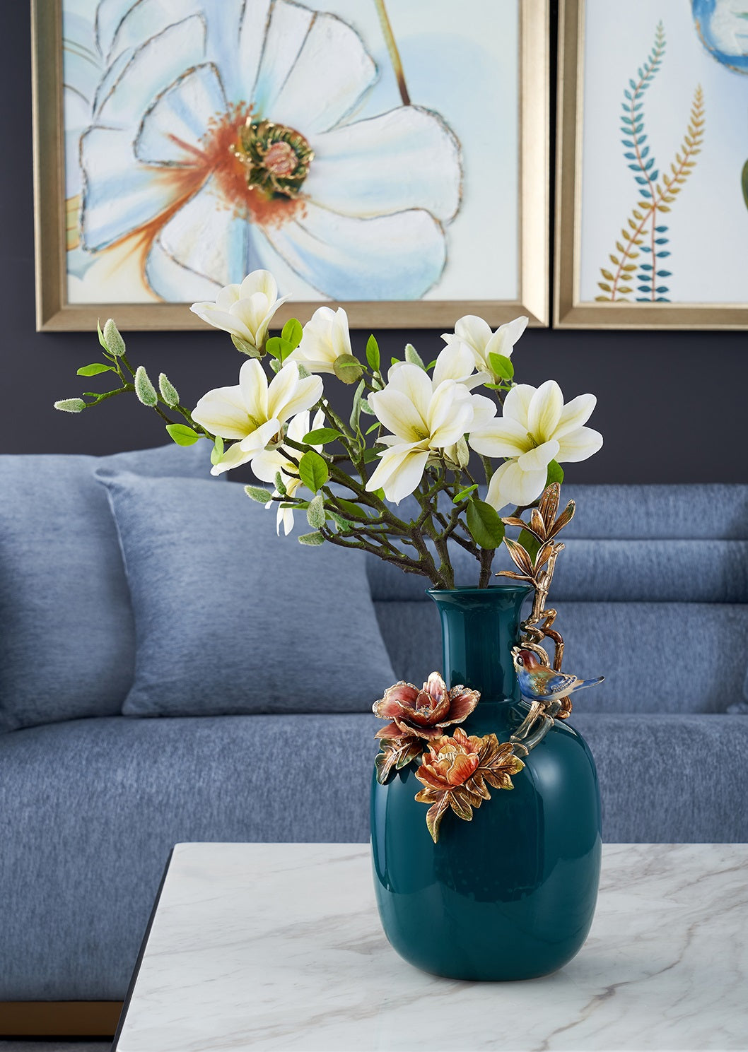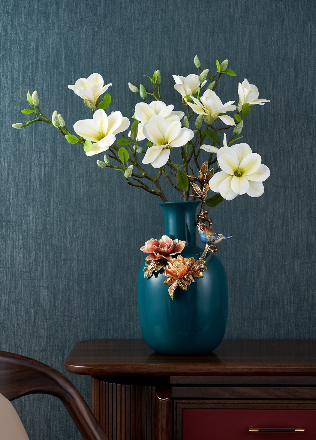 مزهرية خزفية مصنوعة يدويًا بلون أزرق مخضر غني، بنقش زهريّ بارز ولمسات معدنية. تُضفي هذه القطعة لمسةً من الفنّ النباتيّ والأناقة المعاصرة على الديكورات الداخلية الراقية.