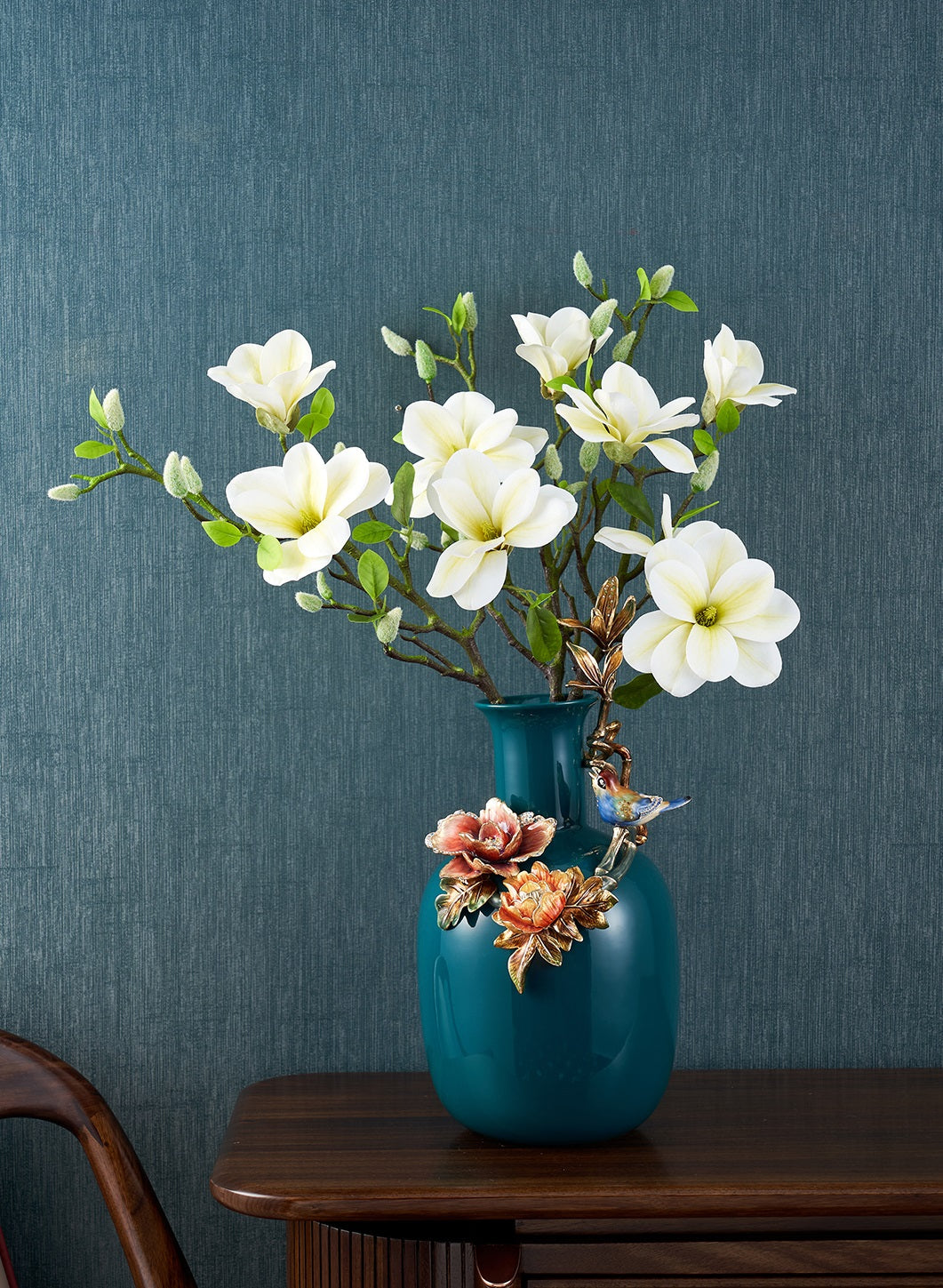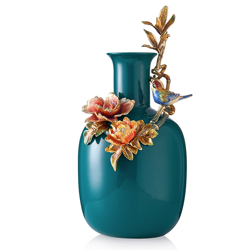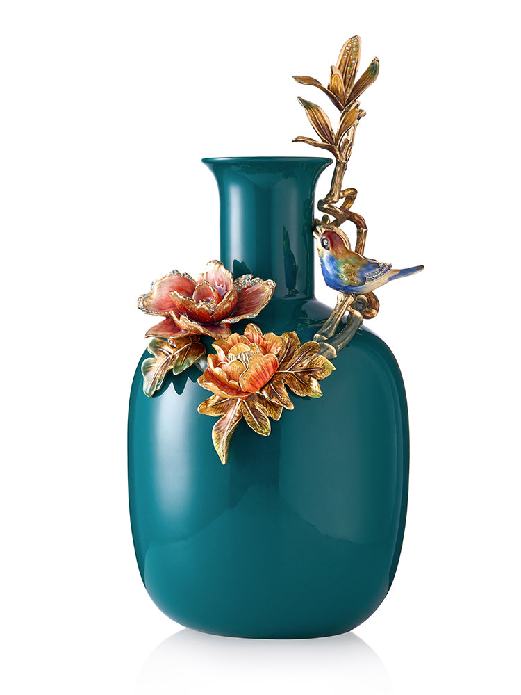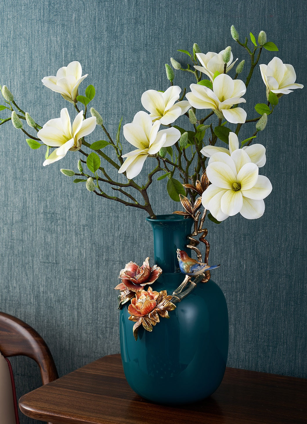 مزهرية خزفية مصنوعة يدويًا بلون أزرق مخضر غني، بنقش زهريّ بارز ولمسات معدنية. تُضفي هذه القطعة لمسةً من الفنّ النباتيّ والأناقة المعاصرة على الديكورات الداخلية الراقية.