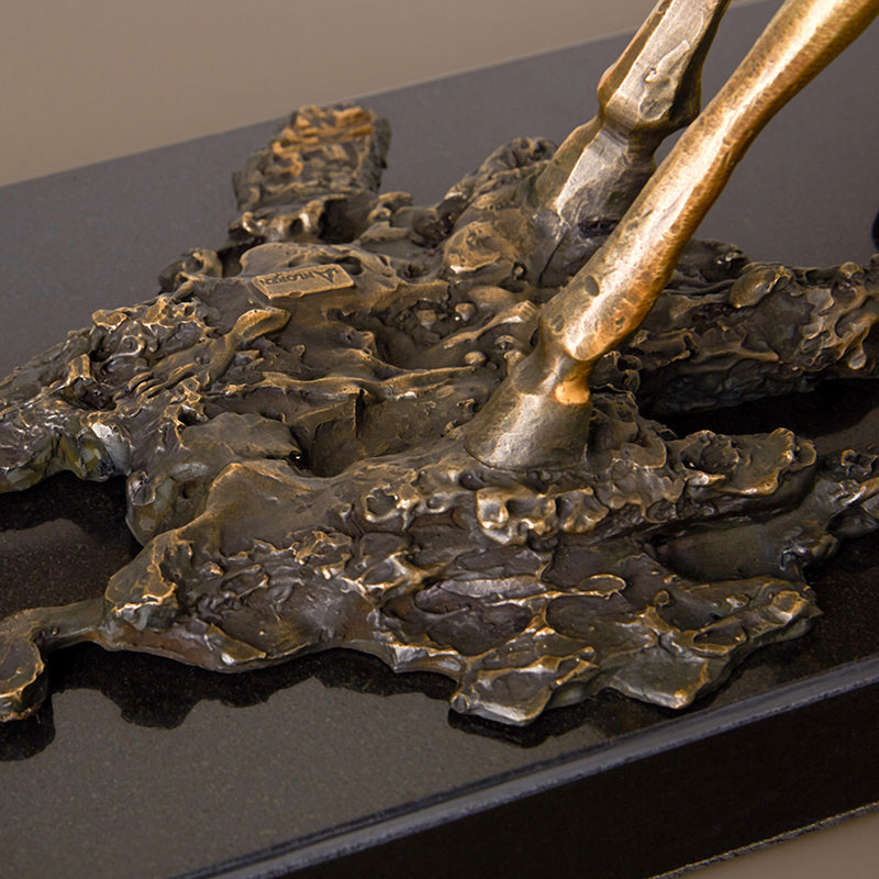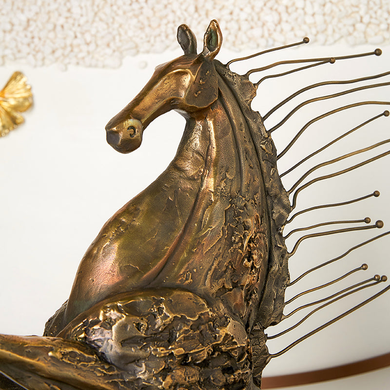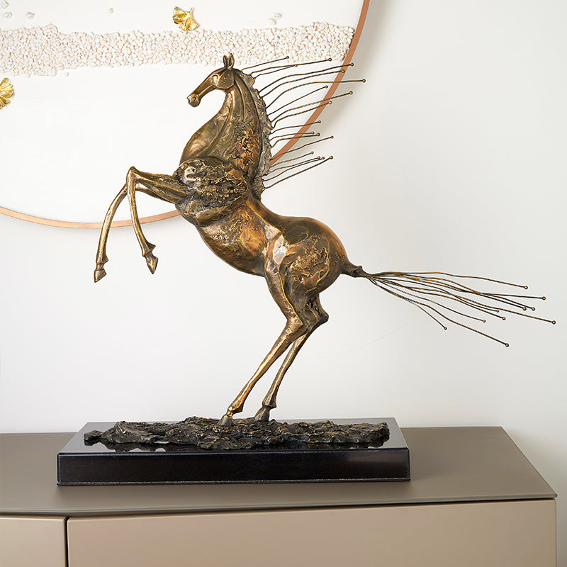This handcrafted figurine of a rearing stallion features intricate golden details and flowing strands, symbolizing both strength and freedom. Its majestic pose and dynamic lines make it an ideal statement piece for sophisticated spaces that demand elegance and energy.